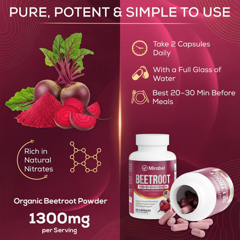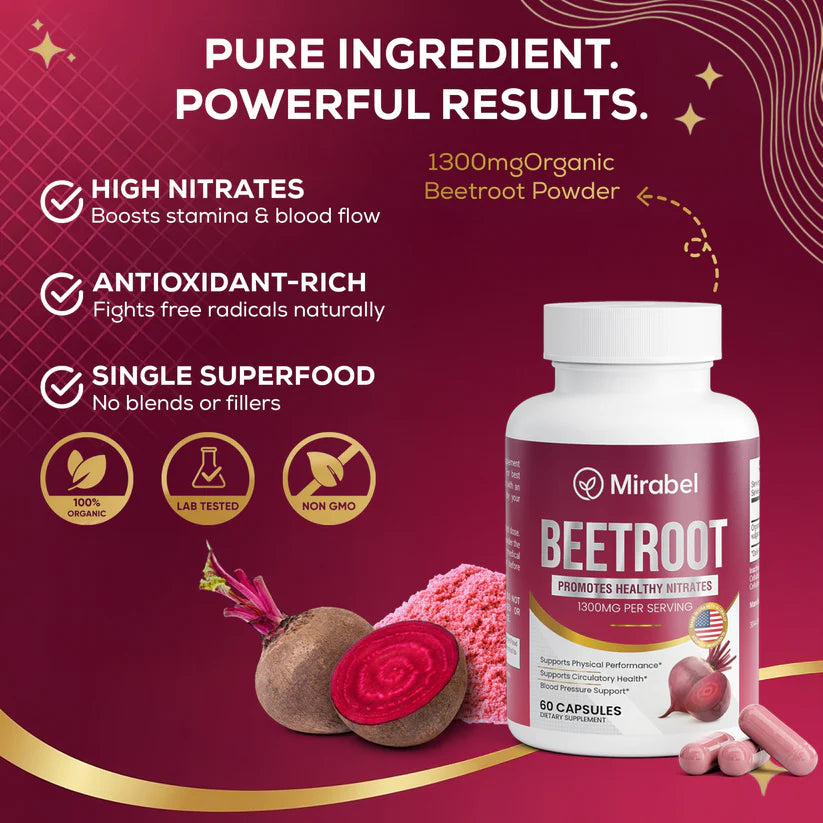 Why choose synthetic when nature works better? Mirabel Organic Beet Root delivers natural nitrates and antioxidants for real circulatory support—no stimulants, no artificial ingredients. Just one daily capsule for clean, effective results.